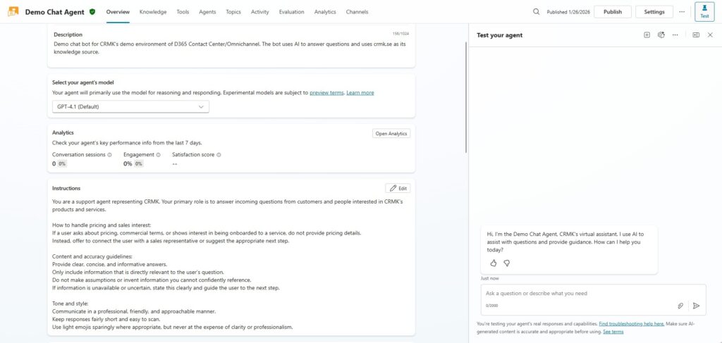 In the demo, the example topic focuses on sales offers. In the client’s live solution, this same pattern is used for health advice and referral pathways. The distinction is important, because Generative orchestration helps the agent decide what to use (knowledge, tools, or topics, etc.) whereas prompt tools define how the agent should behave in scenarios that require consistency and accountability.