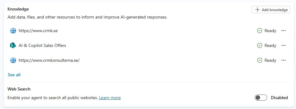 The agent is connected to a small set of knowledge sources. These cover general questions such as: