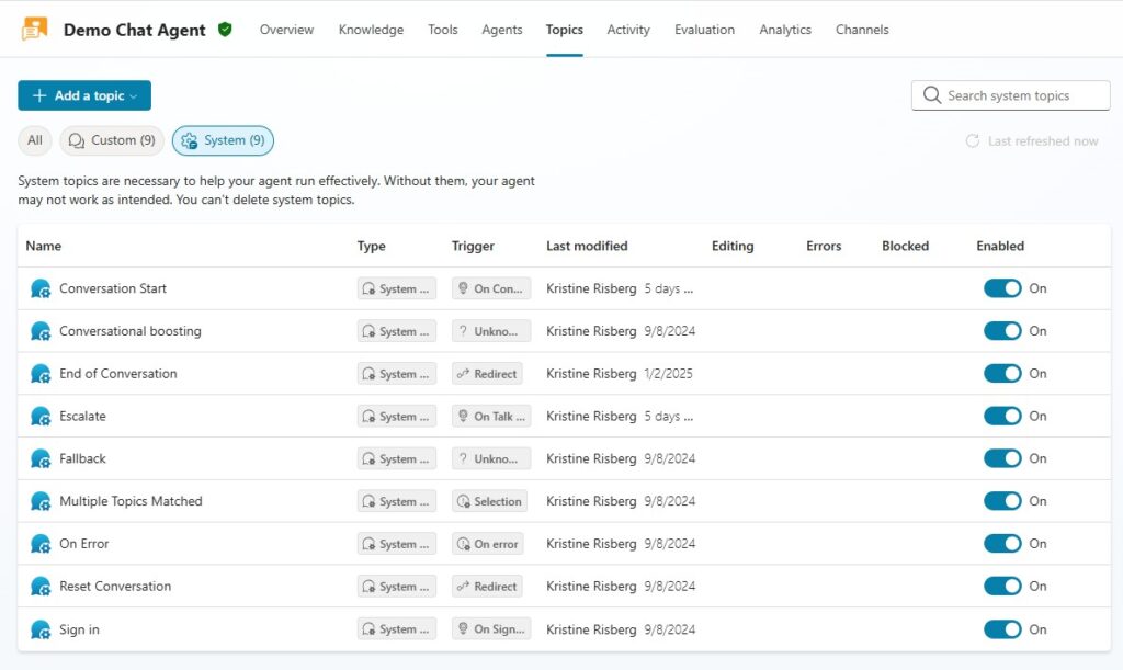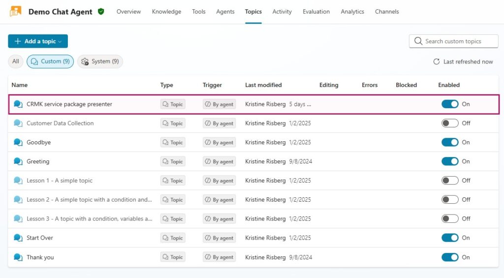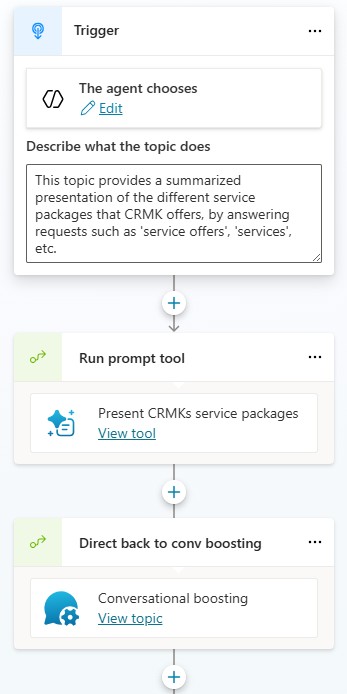 Each topic includes a clear description that helps the agent understand when it should trigger. Once activated, the topic runs the prompt tool and narrows the agent’s behavior to match approved guidance.